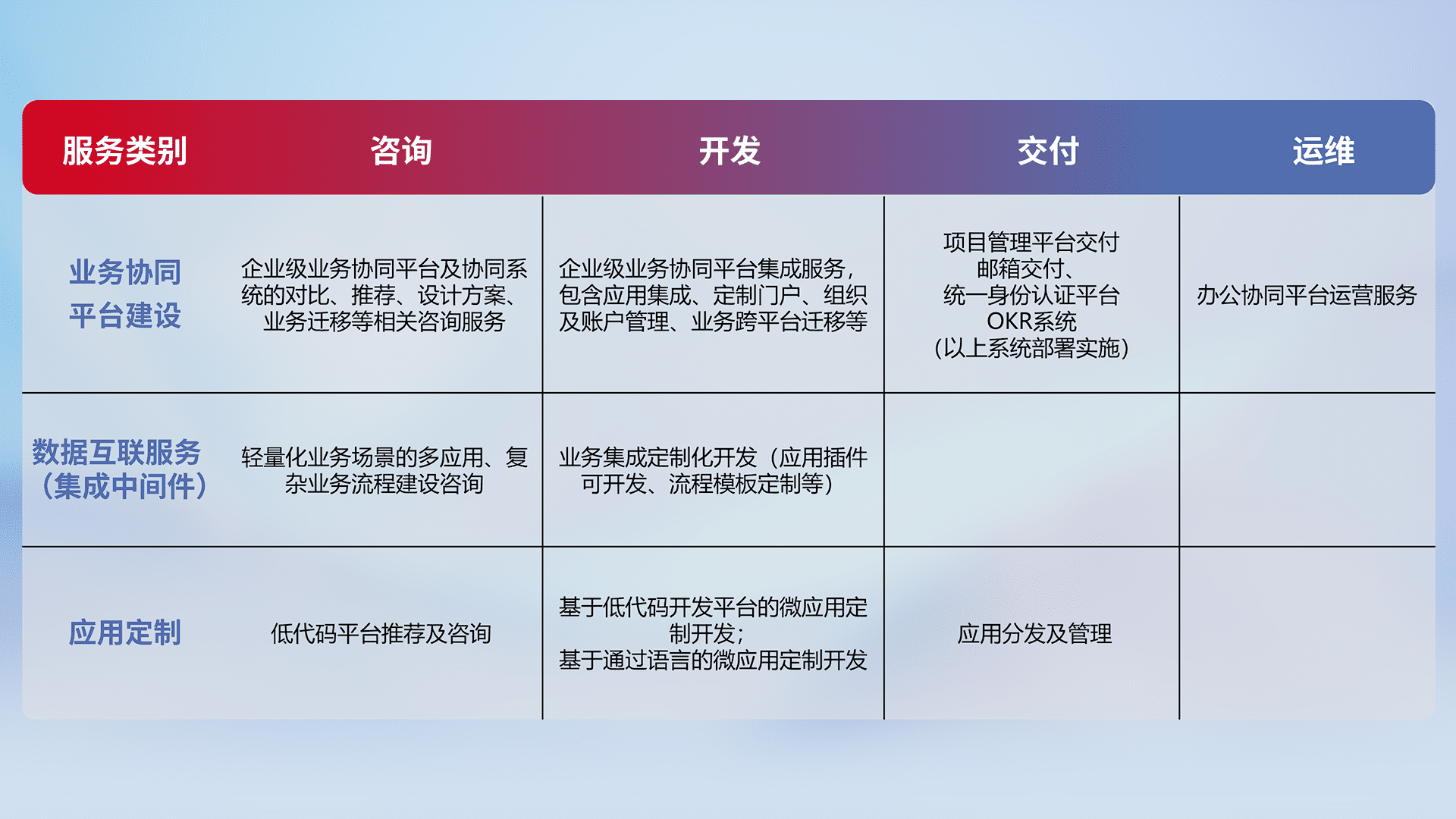 针对钉钉、、企微、、、IDaas等平台级产品提供产品的规划、、、、方案、、、交付、、、定制化开发等服务,,,,实现如统一协同办公、、、、智能客户服务、、、混合会议管理、、、智能数据查询、、等业务场景,,实现数字化转型。。。。